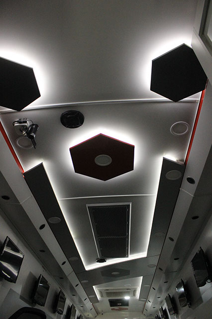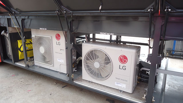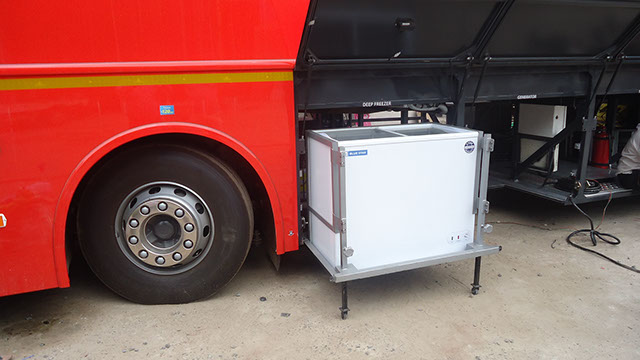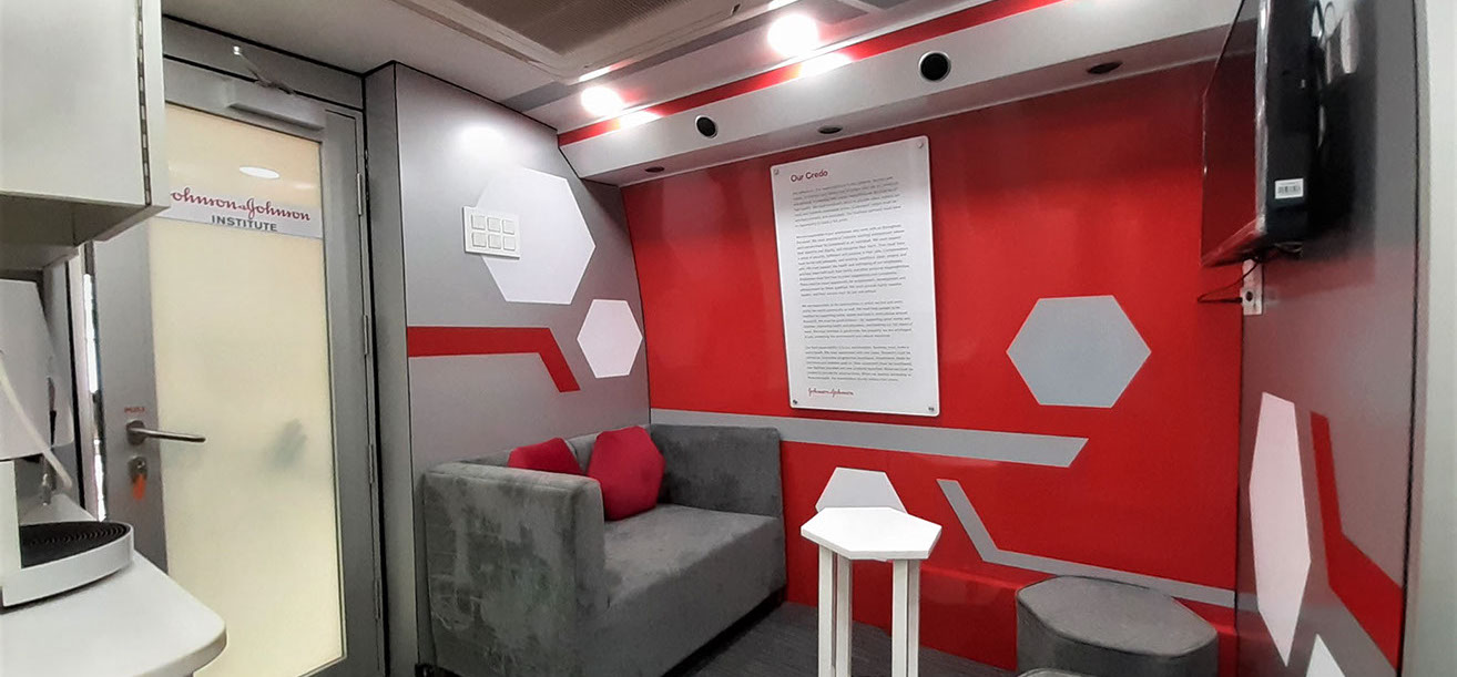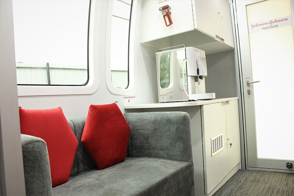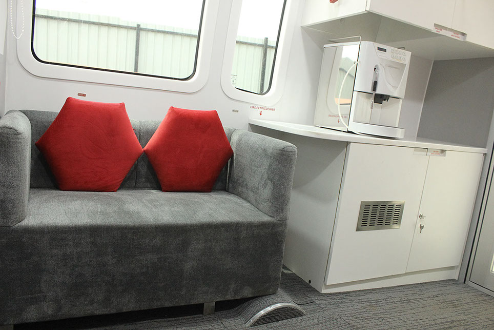 Lounge and Pantry area : Fully AC compartment with both AC unit, driven on vehicle engine and generator. Also has 32” LED display TV, coffee vending machine, pantry table with electric powered wash basin, Sofa set, Refrigerator . This is mainly used as rest room for faculty.