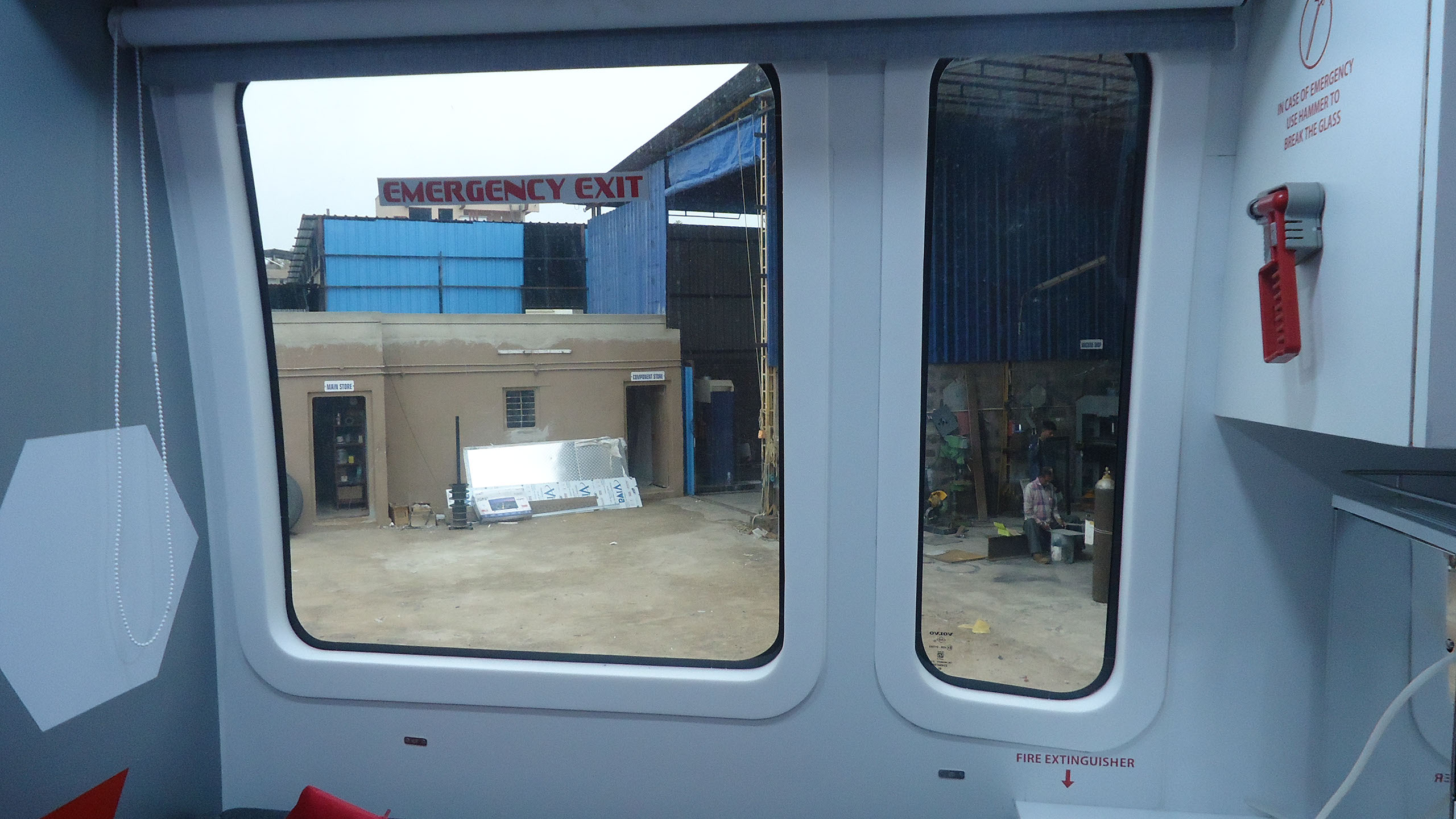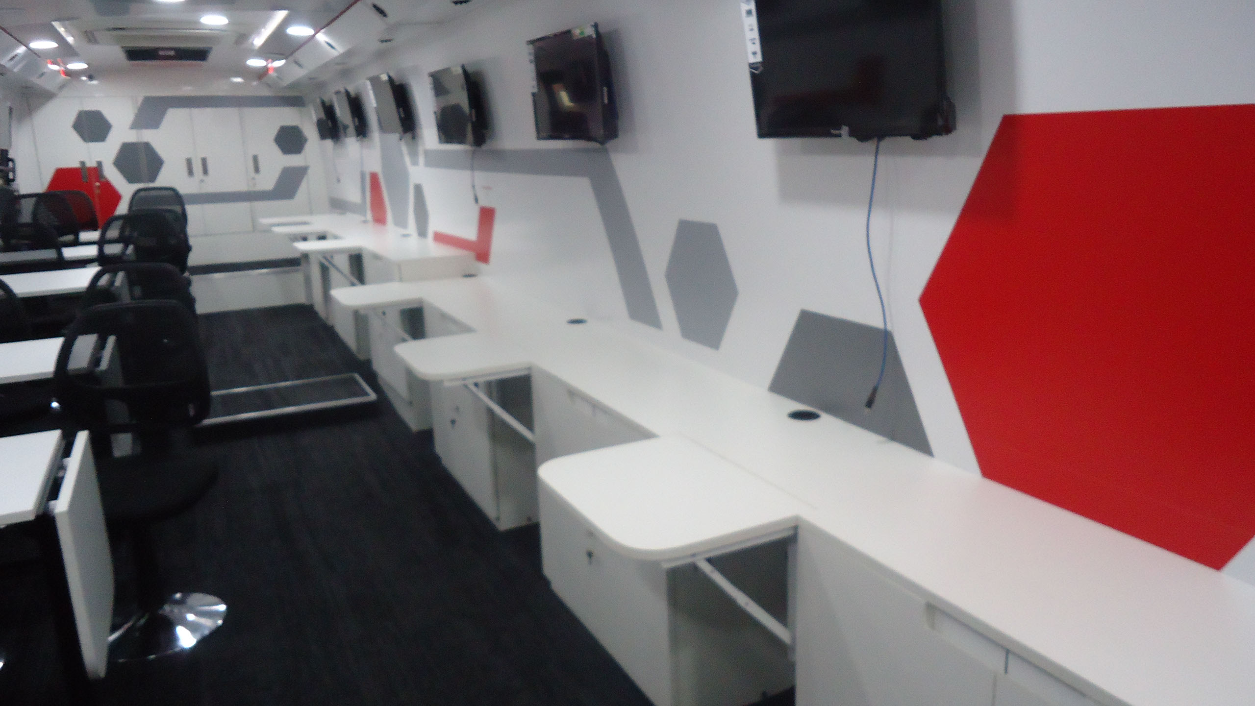 Training compartment : Fully AC compartment with both AC unit, driven on vehicle engine and generator. It consist of one faculty table and twelve trainee tables six on each side with storage cabinets. This compartment is also provided with twelve LED display screens (six at each Left & right side) and one at partition wall behind the faculty, with web camera to display the training program demo given by faculty.