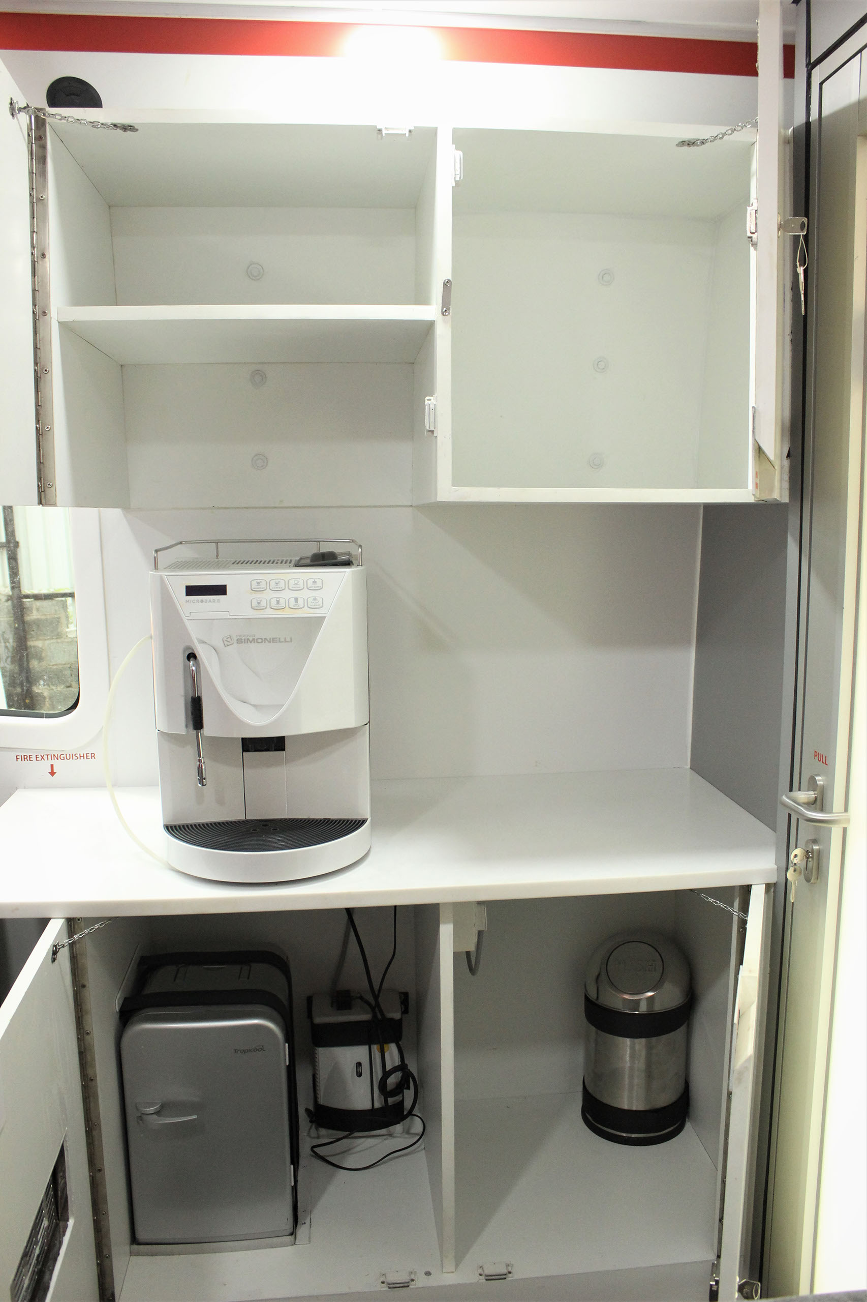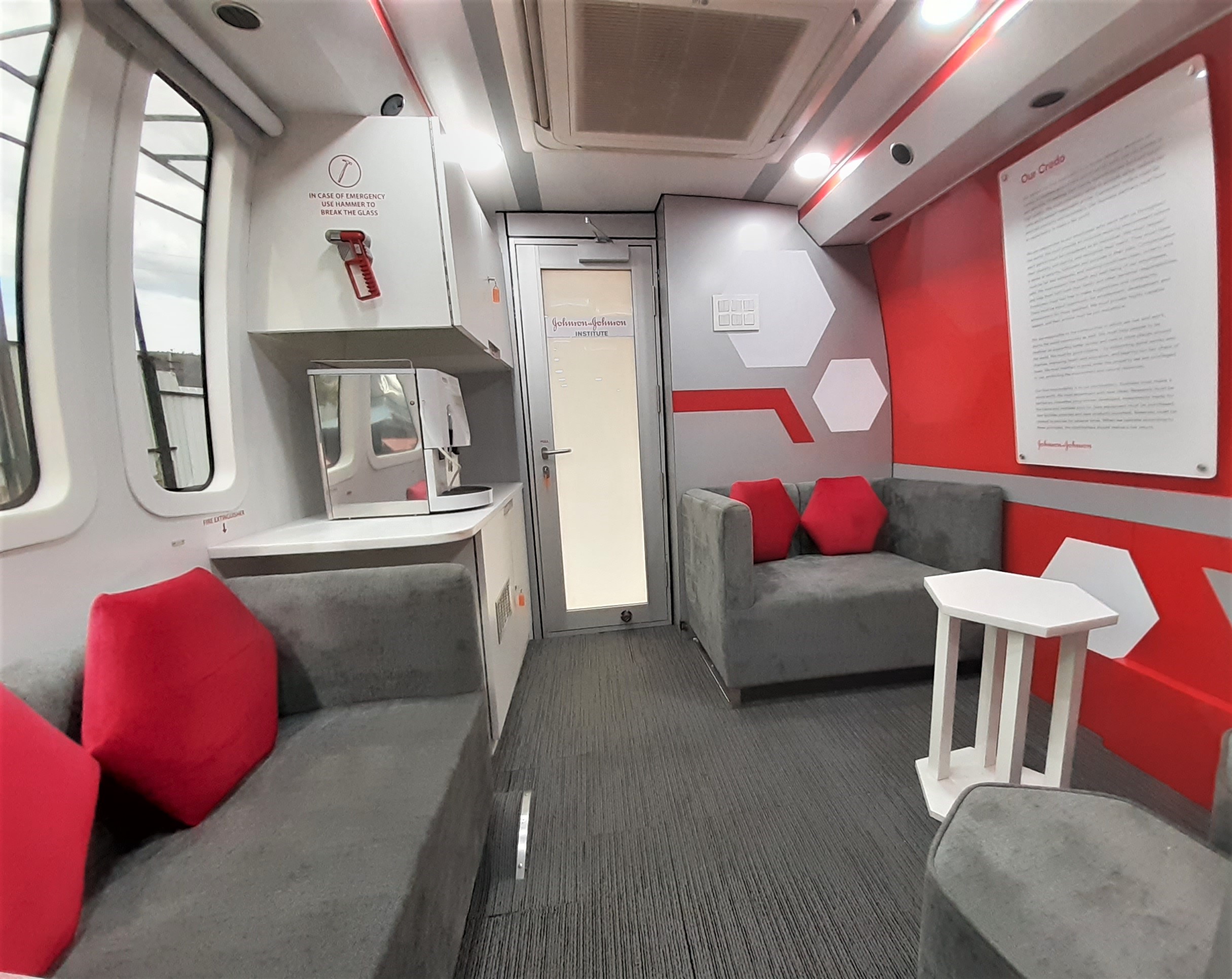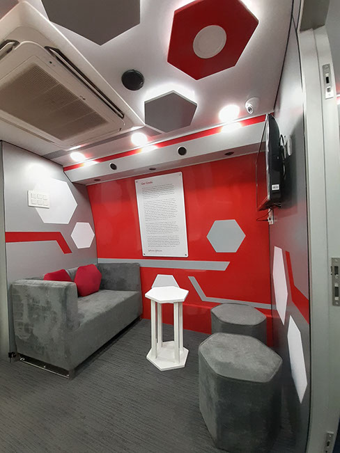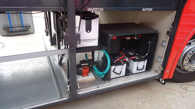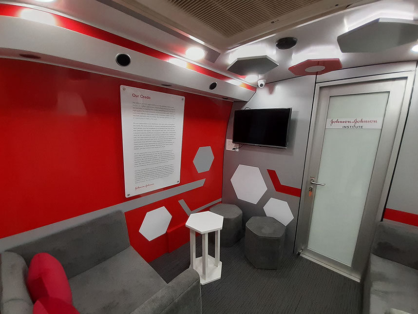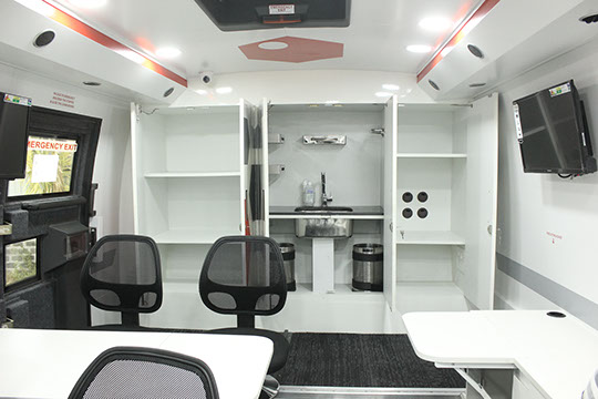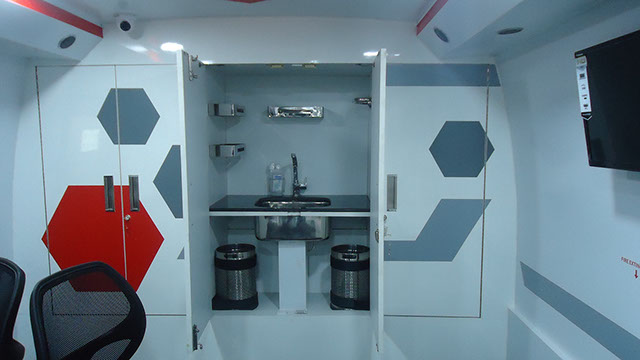 Lounge and Pantry area : Fully AC compartment with both AC unit, driven on vehicle engine and generator. Also has 32” LED display TV, coffee vending machine, pantry table with electric powered wash basin, Sofa set, Refrigerator . This is mainly used as rest room for faculty.