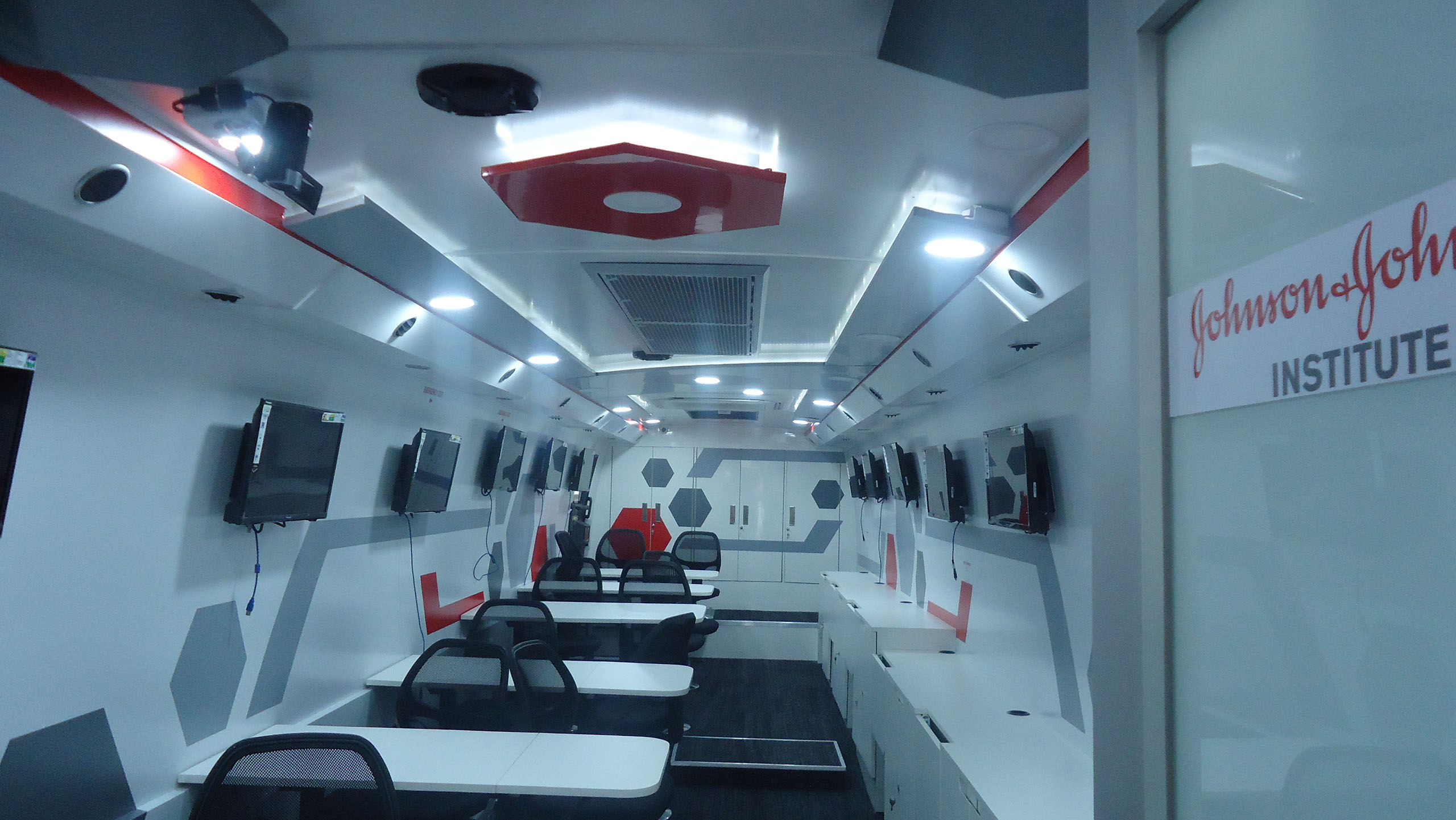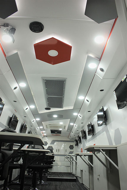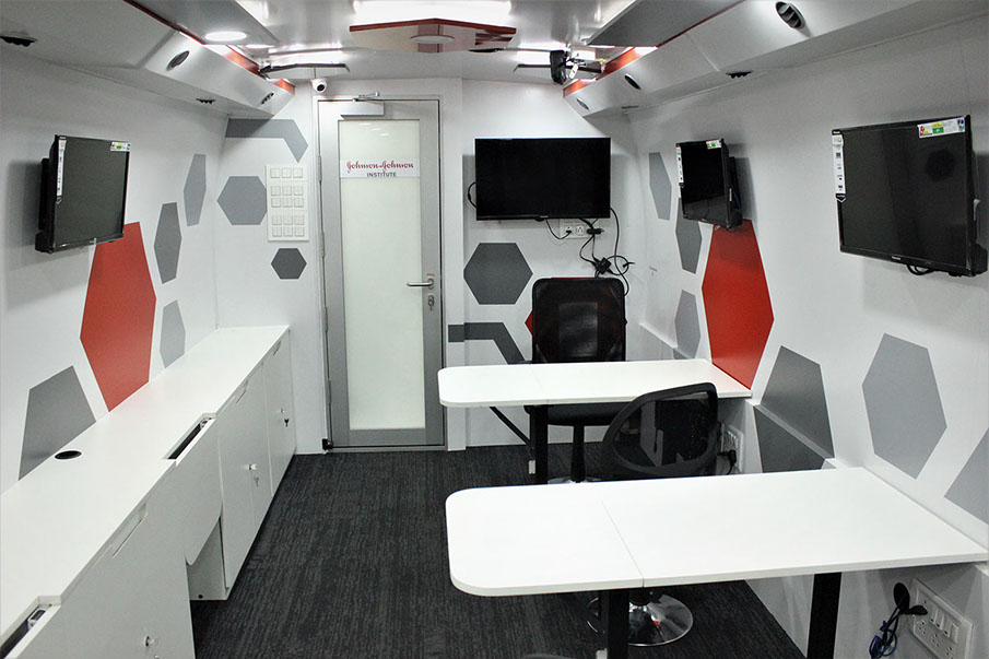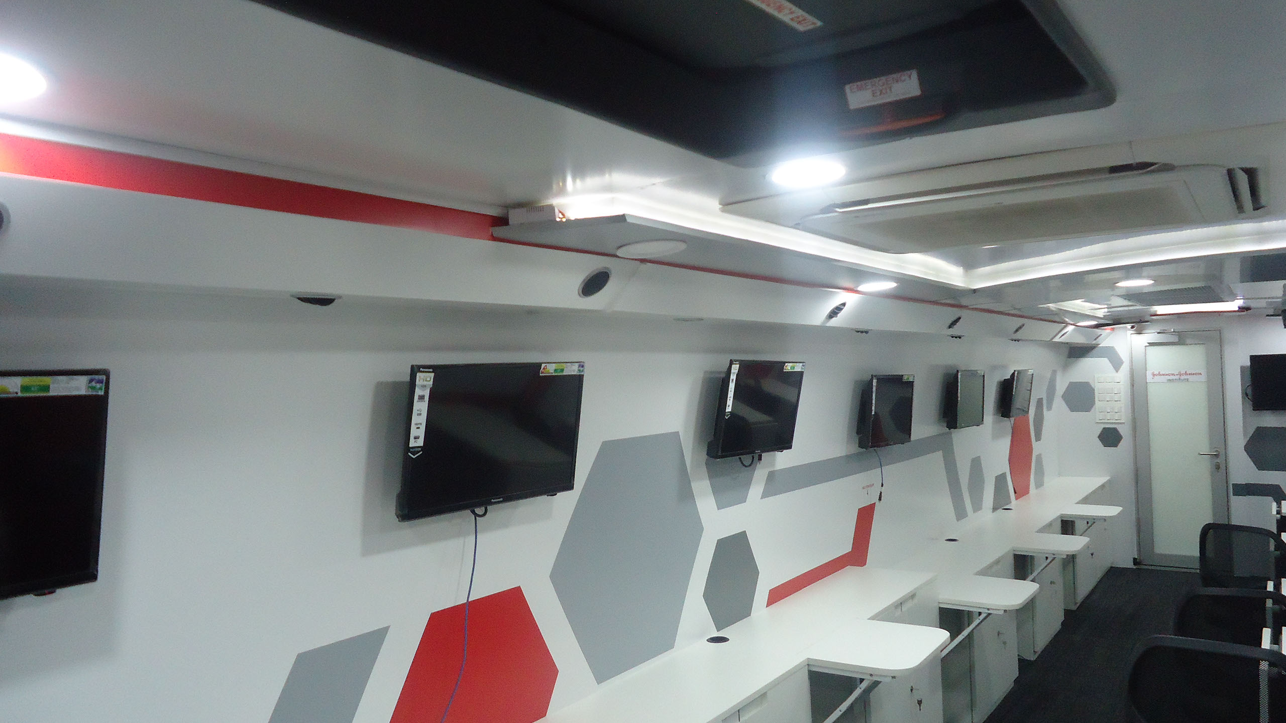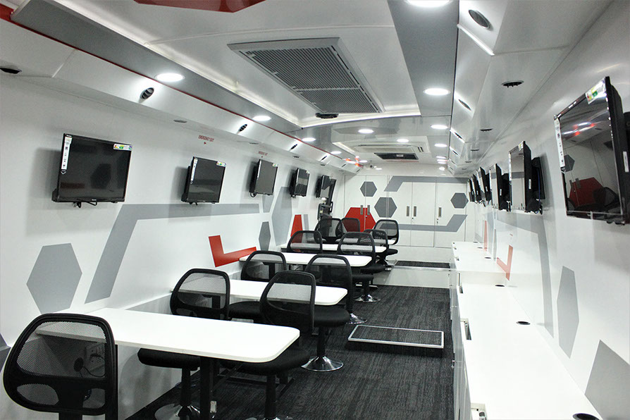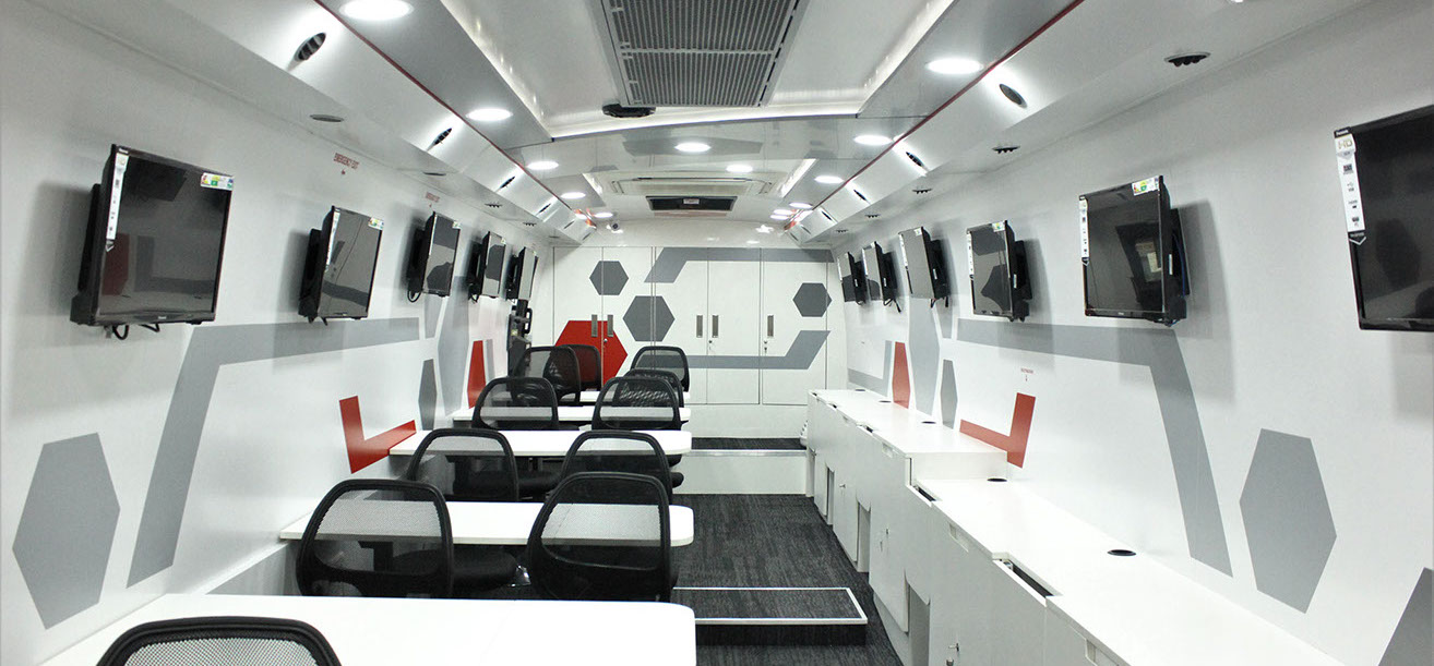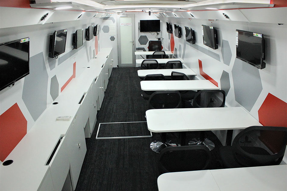Training compartment : Fully AC compartment with both AC unit, driven on vehicle engine and generator. It consist of one faculty table and twelve trainee tables six on each side with storage cabinets. This compartment is also provided with twelve LED display screens (six at each Left & right side) and one at partition wall behind the faculty, with web camera to display the training program demo given by faculty.