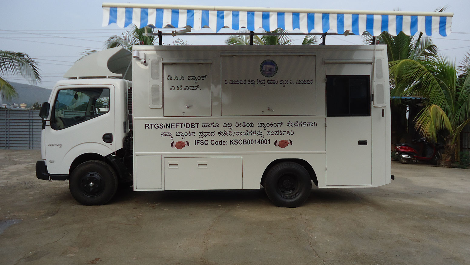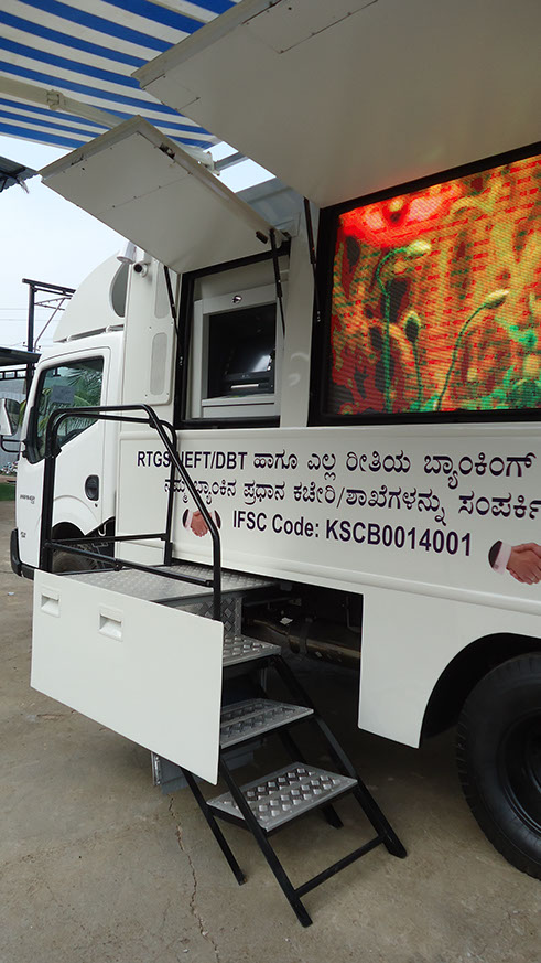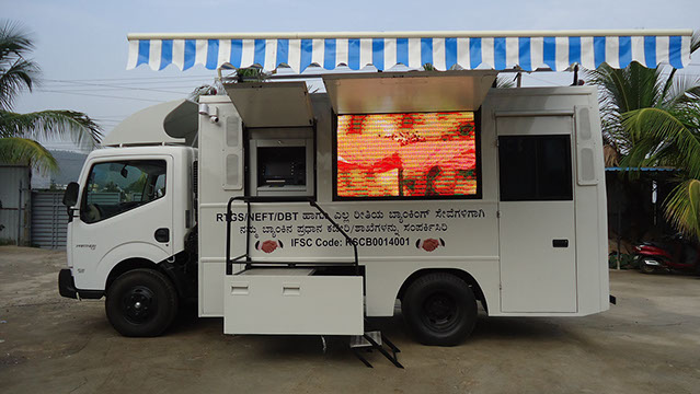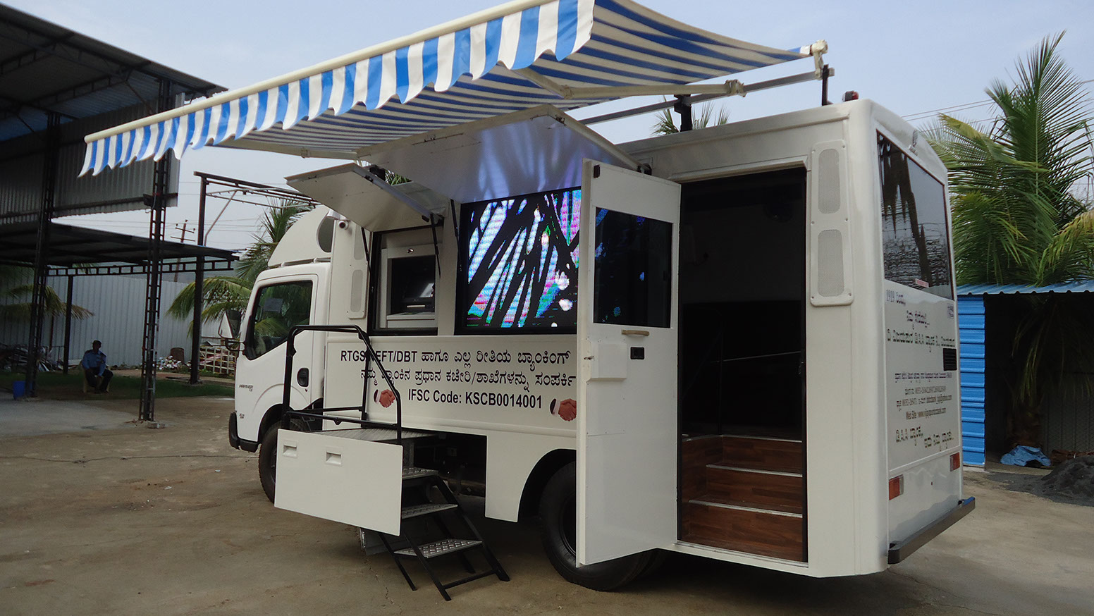 Mobile ATM Van/ buses are used to provide ATM services in rural, & remote areas by Banks to help people get access to money when regular ATM boots are not available . They are also used by banks to display various schemes, products services of bank for marketing & educating customers, many of our variants also have features like bank account opening , loan application and various other schemes provided by bank present in them